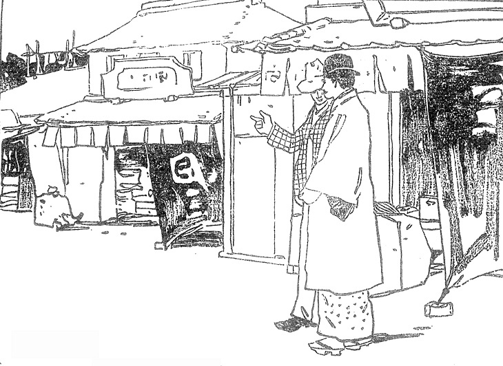 | 説明 | この時代でもやや古風な商店街。東京でも場末に行けばいくらでも見られる店構え。店屋はふつう早朝大戸をあけると、日射しを遮る長い暖簾以外は開けっ放しになる。大都会の目抜き通りには、西洋風のショーウインドやガラス戸などが入りはじめているが、板ガラスの普及に関しては、小さな店ではガラス障子を、店先にではなく店と奥の境に入れる方が早かったといわれる。そぞろ歩く二人の男のうち、手前の和服の男は、上に二重廻しとも、モジリの外套とも見えるものを着ているが、画家の省筆のためはっきりとはわからない。履いているのはのめりの駒下駄。(大丸 弘) |