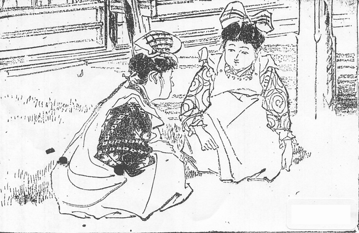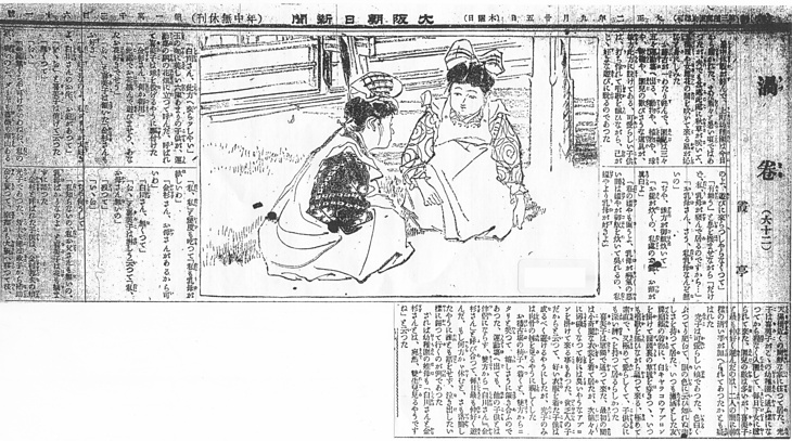 | 説明 | 嫡子に生まれながら家を継ぐこと能わざる淑女、卑賤の生まれながら巨万の富と名誉を相続する青年、その二人の絡み合いを描いた作品。トップクラスの多作家だった渡辺霞亭の作品中でも、もっとも当たった新聞小説。有名結髪家によって〈渦巻〉という名の束髪がつぎつぎに考案、発表されたが、束髪の名前としては向いていただろう。挿絵は幼稚園の休み時間に花を摘んでいる仲良しのふたり。「いつも瀟洒(アッサリ)とした友禅縮緬の着物に、白キャラコのアプロンをかけて、護謨裏の草履を穿き(……)」というのが恵まれた一方の子、もう一方はときにはかなり薄汚くなって、臭いようなエプロンを掛けてきたりするというが、挿絵からではわからない。頭からはみ出るような大きなリボンを頭のてっぺんにつけていること、エプロンの形に張りだし部分――エポレットのついていることなどがこの時期の流行の様子。1910年代も半ばに近づいてくると、子どもの服装に洋服が入りはじめるのだが、東京に比べてこの物語の舞台の大阪では、その点はかなり遅れていた。(大丸 弘) |