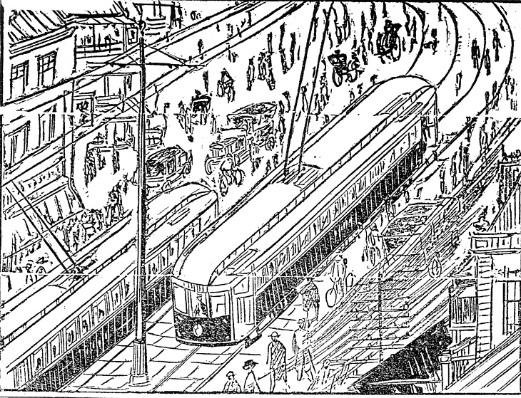 | 説明 | 青森県の日本海岸、当時はまだ寒村といってもよかった浅虫から東京の上野に出てきた人々。「ただ呆気に取られてめまぐるしい都の街を眺めた。人力車、自転車、自動車、電車、その間を巧みに駆け抜けてゆく人々の敏捷(スバシコ)さ(……)」。挿絵は上野駅から広小路方面にかけての鳥瞰だろう。馬車の時代は終わっていたが、バスの運行は関東大震災後の1924(大正13)年からなので、1910年代のこの頃は市内電車が市内交通の王者だった。電車は便利で安く、山の手や郊外方面から下町の商業地区に買物や遊覧の人の足が繁くなったのも、市内電車のおかげだった。ただしその市電はいつも混んでいて、また安全地帯の地面から電車の床までの段差が大きく、きものの女性には難儀だった。また、馬車こそ少なくなったが、貨物運搬用の馬力と呼ばれる、一頭の馬の挽く荷車の数はかなり多く、そのほか郊外から出てくる牛車、人の引いている大八車やリヤカーと、形もスピードもヴァラエティのある車のたぐいが右往左往していたことになる。(大丸 弘) |