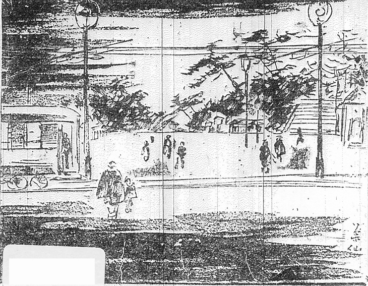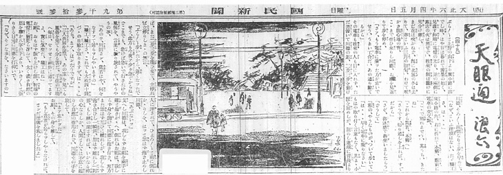 説明 東京上野の、山上の公園から石段を下り、広小路に下りたあたりの景観。石段を上がったところに西郷隆盛の銅像が立つ。銅像の建ったのは1898(明治31)年だから、もちろんこの物語のときにはあった。お上りさんの群れを含めて、東京でももっとも繁華な地域だが、この辺りから正面奥の池ノ端へかけて、明治中頃ぐらいまではずいぶん暗いところで、夜歩くには提灯が必要だったらしい。この挿絵では市内電車の安全地帯の照明灯二基を含めて、種類のちがう街灯が四基みえるが、街の明るさ暗さは街灯の光などより、軒を接する商店の活気のある店頭照明によるのだから、この時代はどうだったのだろうか。「見渡す軒端に電灯の光、道の両側に露店の灯は照らせど、往き来の顔は朧げに見分け難し」とある説明から想像するしかない。(大丸 弘)
