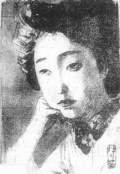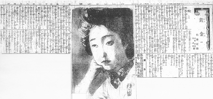 | 説明 | 第1回は例によってヒロインの紹介にたくさんの行数が割かれている。そのうち身につけているものの説明は、「荒い大縞の上下に御正月だからというので梅鼠の紋羽二重の紋付羽織を着て居る。きものと羽織と調和はない処に彼女の大人しさが見えて、羽織は三四年前のが未だに妹のものともならずに用いられて居るのが解る」。ここで「上下(ウエシタ)」といっているのは和服のことだからもちろん、二枚重ねの上着と下着のこと。御正月などに昔は三枚襲を着るのがきまりのようになっていたが、この時代には古風さを守る家はだんだん減ってきていた。この日の挿絵担当は北野恒富、日本画家だが洋画の技術をじゅうぶん咀嚼して、陰影の深い女性像を残した。この日のヒロインの大首も、二十三歳になる姉娘の、心の陰影を表現しようと試みているのが感じられる。(大丸 弘) |