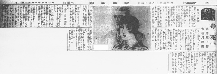 | 説明 | 薬剤師の夫と妻の間がうまくいかないのは、妻の姉が旦那とりをしているため。東京の下町では、器量好しに生まれた貧乏人の娘が、芸者になったり旦那とりをしたりするのを、当たり前のように思う気風がかつてはあった。新しい教育を受けた世代には理解しにくいことだが、しかし同じ新しい教育を受けて現代の風を呼吸はしていても、人並以上の美しさに恵まれた女の心の中に、ふとその美しさが、周りの人や自分を傷つける、毒のようにはたらくときがある――。挿絵の断髪女性はそんな人並み以上の美貌。陰影の濃い眼窩の表現は西洋人風だが、眉毛、口もと、顎の辺りは日本式にした現代風人形顔。画家の大橋月皎は日本画家で主に美人画を描いて人気があった。男女ともにこのタイプの美人を描き、やや現実離れしているせいか時代物の方にもっぱら筆をふるっていた。しかし婦人雑誌の恋愛小説などでは、このタイプの顔が好まれたようだ。(大丸 弘) |