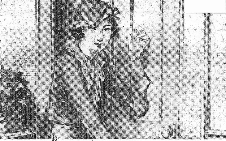 説明 おためごかしをいいながらベッドへ誘う男から遁(ノガ)れて、戸口に身を寄せる娘。そのときドアをノックする音が聞こえた。もっとも、描かれた娘の顔にはそれほどの危機感はないが。1930年代の銀座のストリートガールとしては標準的なスタイル。スカートはロングで、ややホッブル(腰から膝にかけて細まる)気味、大きな襟飾りのフリルとともに、ぜんたいが斜めのラインで構成される。帽子の被り方もそれにマッチ。この時代、フォーマルでなくても洋装に帽子は欠かせないものとされた。断髪にかぎらず髪型が小さくなってきたため、帽子が被りやすく、髪と帽子の調和が必要と説かれた。その一方で、男性では無帽主義が言われだしている(→年表〈現況〉1931年 矢津春男「男服にも単純化運動 続々出来るクラブ」都新聞 1931年10月2日9面)。(大丸 弘)