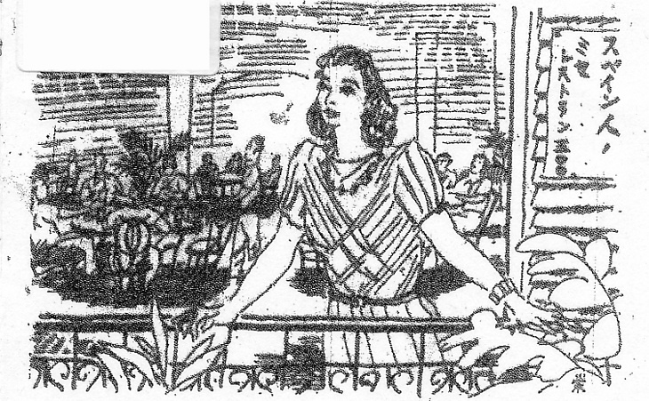 | 説明 | 大当たりをとった尾崎士郎の『人生劇場』は延々とつづき、くりかえし映画化もされ、最後はその過去の人気に凭(モタ)れただけのような作品もある。この遠征篇などがそれ。過去の登場人物の中の何人かが外地に行っての話。窓から外を見ているのはマニラのレストランのウエイトレスで、尾崎は赤いシャツを着た少女、と書いている。宇野千代と一緒に生活していた時期もあるのに、尾崎は着るものの描写などには無頓着な方で、少女の着ているのはもちろんブラウスというべき。そのブラウスはかなり凝った仕立で、このレストランがそう安食堂ではないことを想像させる。尖っているようなショルダーパフはこの時期の流行というより、フィリピンの伝統的スタイル。少女というにしてはつけているアクセサリーも豊富だが、肌の露出の多い熱帯地域では、衣服よりもむしろボディ・ジュエリーに執心なのがふつう。(大丸 弘) |