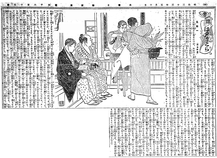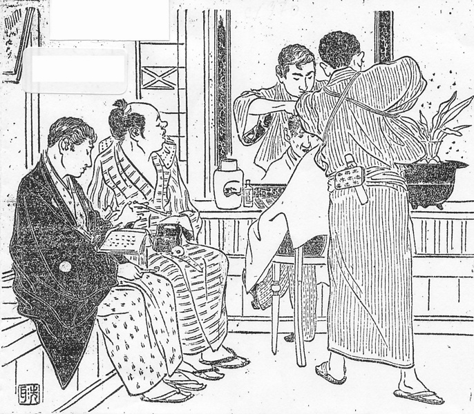 説明 〈遡及資料〉この日の本文は挿絵と関係ない。挿絵は髪結床の店内。崩れかかった髷の男も待っているように、まだこの時代では散髪と結髪の両方の客を相手にしていたはず。「髪結新三」(カミユイシンザ)でもわかるように江戸時代、男も女も出髪結に頼る人が多かった。それが鋏で髪を切る時代になると、男の理髪は店を構える居職だけになる。切った細かい毛が辺りに散るし、洗髪の必要が生じたためでもある。この絵では職人は上っ張りもせず、視野のなかには洗髪の設備もない。近代理髪業への転換期のはじまりというべきだろう。仕事をしている職人が、腰に煙草入れを下げているのも彼らの気っ風のあらわれか。(大丸 弘)