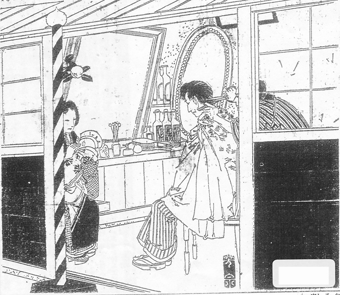 | 説明 | 〈遡及資料〉このころの挿絵にはよく理髪店の情景が出てくる。散髪と理髪店は開化のもっともめざましい現実のひとつだったかもしれない。店頭に見える赤白青のおなじみの標識については、『武江年表』の筆者もこの前の年に記録している(→年表〈事件〉1871年4月 「髪結床に看板とサイン」『武江年表』1871年4月)。また、客の前の壁面に大きな鏡があるのも店内の新しい風景で、このころの工夫という。鏡の前には西洋ブラシや香水スプレー、耳掃除の綿棒などが並べてあり、会話のなかではこれから洗髪にかかるようだが、その設備は描かれていない。客と向かい合って座っているのは、赤ん坊を連れて床屋に暇つぶしに来ているお乳母(オンバ)さん。そんなところに江戸時代の髪結床の名残が見える。乳の出のよい女性だと、自分の子のほかにもうひとりぐらいの子は飲ませられるというが、たいていは子どもを亡くした女性で、乳児死亡率の高かったこの時代は乳母のなり手は多かった。赤ん坊が被っているのは大黒頭巾風。(大丸 弘) |