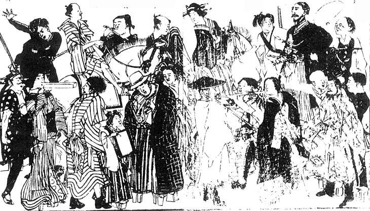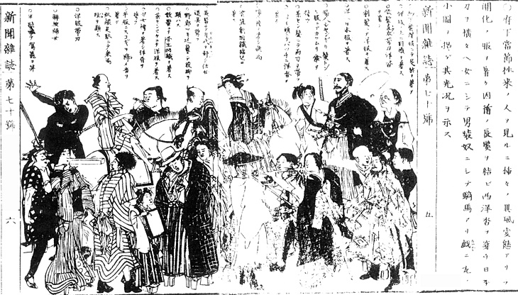 | 説明 | 「府下当節往来ノ人ヲ見ルニ種々ノ異風変態アリ開化ノ服ヲ着ケ因循ノ長髪ヲ結ビ西洋沓ヲ穿キ日本刀ヲ横タエ女ニシテ男装奴ニシテ騎馬アリ戯レニ左ノ小図ヲ掲ゲ其光況ヲ示ス」(→年表〈現況〉1872年11月 「異風の人々」新聞雑誌 70号 1872年11月)。(大丸 弘) |