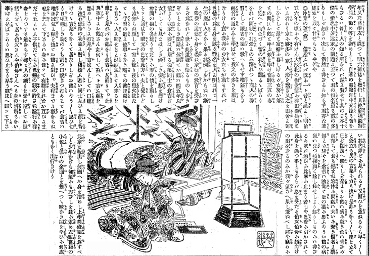 | 説明 | 〈遡及資料〉大阪北の御堂前の、豊かな人形商の家の内。この家に養われている従兄の部屋に、家つきの十五になる一人娘が、夜ひそかに忍んできて想いのたけを掻き口説いている場面。当時の十五はいまの十四、身体的発達は一般に現代より遅れていたはずなので、このような早熟さは本文中にもあるように、「唯益もなき糸竹の道をのみ学ばせて(……)我が邦のおとめたちがややもすれば色情の為に道を誤り浮き名を人に唄われ」という環境のせいだろう。袖を口にくわえて身を反らし、後ろに手をついて膝を崩したポーズも、なにやら舞台の所作事のように見える。机に向かっている従兄も年は同じ十五だが、養われているという恩義も頭にあって迷惑そう。1872(明治5)年,1873(明治6)年という設定で、商家の風俗はまだ江戸時代そのまま。(大丸 弘) |