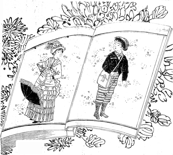 | 説明 | 〈遡及資料〉この1874(明治7)年に主人公の少年とその幼友達の少女はともに十五歳、それにしてはすこし子どもらしいので、挿絵の意図は、九歳からこの年までの小学校時代のふたりの面影、ということでもあろうか。越後の港という設定を仮に新潟としても、1872(明治5)年,1873(明治6)年のこの土地に、こんな洋装の小学生が存在し得ただろうか。この時代の[東京絵入新聞]の挿絵の多くは落合芳幾(1833-1904)の手になり、芳幾は考証にはけっこううるさい方だったが。少女の着ているドレスは、バッスルが廃れて背部に大きなノットやフリルがつくようになった、1880年代後半の欧米のスタイルで、鹿鳴館時代がほぼこれに当たる。この挿絵が描かれた1887(明治20)年の画家の頭には、その夜会スタイルの印象が色濃く残っていたのではないだろうか。(大丸 弘) |