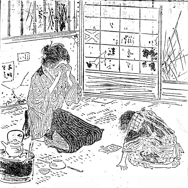 | 説明 | 〈遡及資料〉裏店住まいをしている母親と十歳くらいの少年。火事の火元の疑いをかけられたため郷里の和歌山に居ることができず、東京に出てきた。母親は針仕事に洗濯、少年は枝豆売りをしているが、着ているものが汚いので買い手がいない。それを見かねた通りがかりの女が、着るものを買えと言って一円札をくれた。その一円札をあいだに置いて嬉し涙に暮れている親子。もちろん一間ぎりの部屋には、畳でなく粗筵(ムシロ)が敷いてある。この時代、雨風を遮るのは出入り口を含めて紙張りの障子。女の背後の竹の桟のはまった小窓は、夜だけつっかえ棒を外して閉める蔀戸(シトミド)。(大丸 弘) |