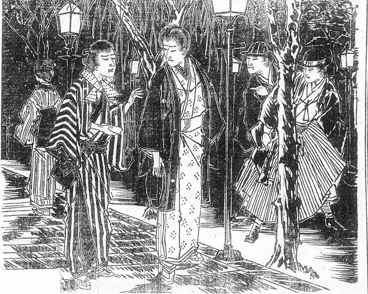 | 説明 | 〈遡及資料〉素性を隠して女を囲っている泥棒の親分が、女を連れて銀座の料亭を出たところで偶然子分と出会い、それを探偵掛に目をつけられる、という場面。この事件は1875(明治8)年の3月という設定、銀座通りにガス灯が設置されたのは横浜より数年遅れて前年の12月だった(→年表〈事件〉1874年12月 『京橋区史』1983年)。柳とともにその後長く銀座の名物となる。親分が開化風なのに比べて子分の方はまだ丁髷。豆絞りの手拭いを首に巻き、打ち合わせの浅いきもので、抜き入れ手した右手を懐から出し、なにかを渡そうとしている。いかにも古風なやくざ風。ふたりの探偵は和服に帽子と靴。この時代にふつうに見られるスタイルだが、とくに探偵を表現するときにこのように描かれる。もっともほぼ同じ時代で、いつも紺の法被に股引だった、という証言もある。制服でないこういう和装の探偵を角袖の警官、あるいは単に「角袖」と呼んだ。1886(明治19)年には刑事、または特務巡査はかならず袴を穿くように、という指示が出ている(→年表〈事件〉1886年1月 「刑事、特務巡査等は着袴」朝野新聞 1886年1月30日4面)。(大丸 弘) |