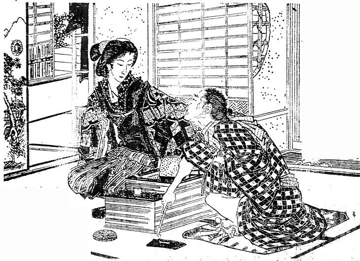| 説明 | 〈遡及資料〉やくざ者の父親が、博打の元手を借りようと、一人住まいの娘のところに来て凄んでいるところ。娘は人気者の軽業師。襟付きの縞のきものをゆるく着て、派手な柄の半纏を重ねている。女の髪は潰し島田かもしれないが、髷の後ろがひどく突き出ている点、根掛けの目立つ点などが不審。この時代、まだ丁髷のままでいるアウトローの父親は、粗い弁慶格子のきものに三尺を締め、豆絞りの手拭いを肩に載せている。手拭いを肩に載せるのは、腕まくりや片裾をまくることと共に、勇みのしるし。(大丸 弘) |
