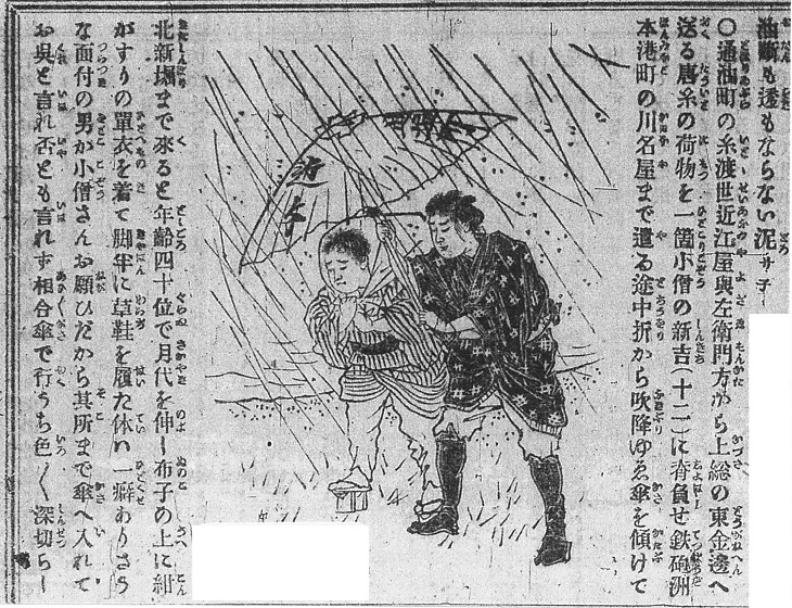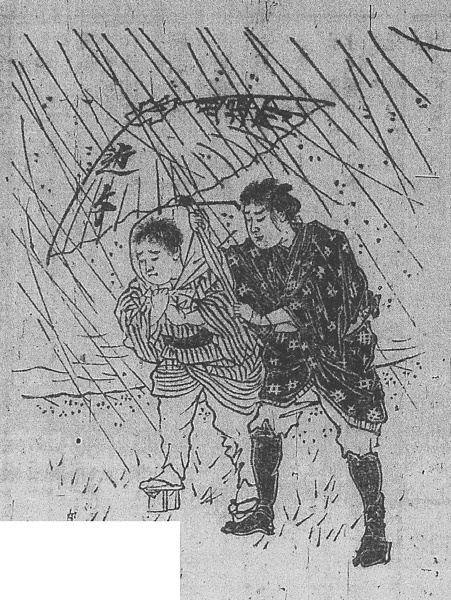 | 説明 | 日本橋通油町の糸屋の小僧が、吹き降りのなか、鉄砲洲まで大荷物の届け物の使いにやらされた道で、胡乱(ウロン)な男と道連れになる、という場面。十二歳の小僧はまだ奉公して間がないだろう。男の子のきものといえば絣に決まっていたような時代だが、商家の奉公人の仕着せは縞物。雨降りなので高下駄を履き、裾を高くまくっている。店の名の入った番傘は連れになった男が親切ごかしに持っている。「月代(サカヤキ)を伸ばし布子(ヌノコ)の上に紺がすりの単衣を着て脚絆に草鞋(ワラジ)」とあって旅をしてきた姿。布子というのは木綿の綿入れのきもので、貧乏人は冬を通してこれ一枚、ということも多かった。男はそのたぶん藍色の布子を肌つきに(下の襦袢なしに)着ているのだろう。この時代、貧しい人は入浴は頻繁にしても肌につくものを滅多に洗濯せず、白い下着や裏地を用いなかったのはそのせいもある。その不衛生さを指摘する意見がいくつかある。(→年表〈現況〉1874年3月 岸田吟香「養生小言」東京日日新聞 1874年3月6日1面;→年表〈現況〉1875年5月 「投書―肌着の洗濯」読売新聞 1875年5月30日2面)がある。(大丸 弘) |