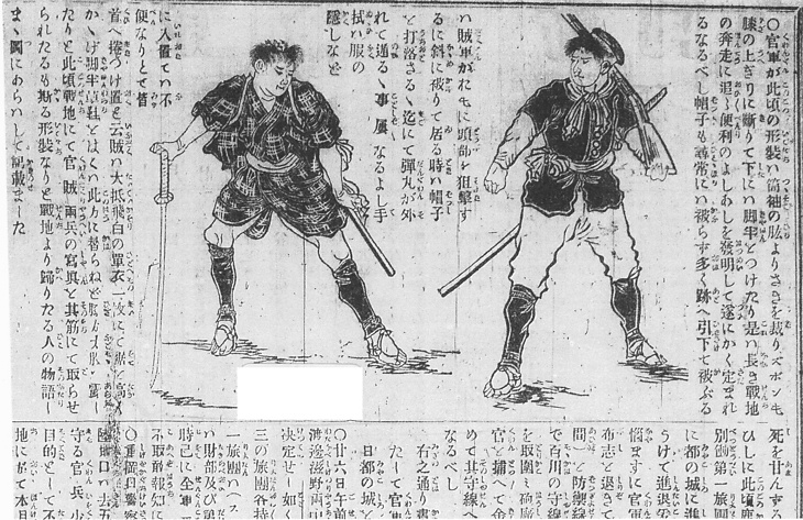 | 説明 | 西南の役における、官軍と西郷軍との標準的軍装。伝聞によったものだが最近現地で撮影した写真もこれと変わりないと断っている。賊軍、すなわち西郷方は薩摩絣の単衣に兵児帯、襷掛けで脚絆草鞋(ワラジ)だから、軍装というより旅装束。官軍は長袖のジャケットの肘から先を切り落とし、白いズボンも膝の上で切り落としている。ただし、そういう処置をしたのが、この報道の7月末以前のいつだったかは不明。2月半ばにはじまったこの戦役の主要な戦闘は4月までで終わっていた。政府軍は夏服の補給が間に合わなかったということだろうか。両軍に共通するのは草鞋がけであること。戦争を当て込んでの製靴事業も始まっていたが、この時代の国産の靴の品質は劣悪で、とても長時間履けるようなものではなかったらしい。日清戦争(1894年,1895年)のときでさえ、陸軍省はマニラ麻製の軍用草鞋の製作を考えていた(→年表〈現況〉1894年7月 「軍用草鞋」東京日日新聞 1894年7月15日3面)。各新聞社の特派員はほぼ例外なく脚絆草鞋がけだった(→年表〈現況〉1894年10月 「旅装」東京日日新聞 1894年10月13日10面)。(大丸 弘) |