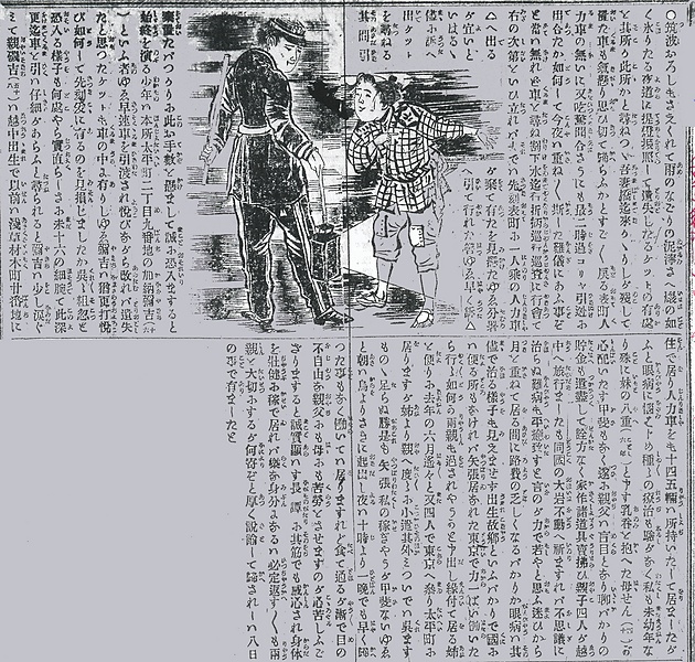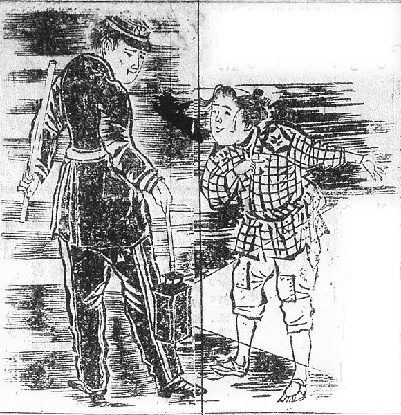 | 説明 | 人力を曳いて老いた両親と幼い妹を養っている十六歳の少年の孝行美談。見失ったケットを探しているうちに人力車もなくなってしまい、驚いて行きがかりの巡行巡査に訴えている。少年はまだ前髪だちの半髪(丁髷)。男の髷は、東京ではもうめずらしかった。筒袖のきものに三尺を締め、膝に継ぎの当たった半股引、草鞋ばき。一方、東京の巡査は1874(明治7)年にはこの図のような、フランス式の紺ラシャ製の丸帽、測線の入ったズボンという制服制帽になり、三尺の警棒を持った。ただしこれは地方によっていろいろで、全国的な統一は1896(明治29)年のこと(→年表〈事件〉1896年11月 「5日、巡査服制の改正」東京日日新聞 1896年11月27日4面)。(大丸 弘) |