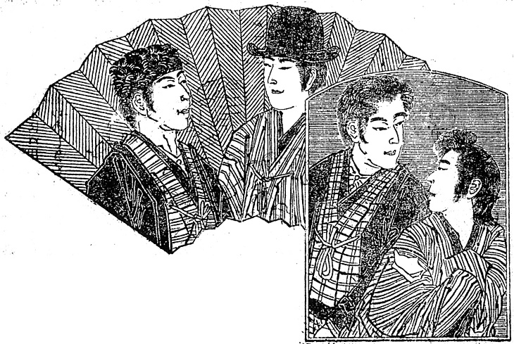 | 説明 | 二つの画面は同一人物の数年以前と、現在の姿を示す。紀州根来の旧士族で酒色のため身を持ち崩した男が、大阪で活版社を経営する人物を頼ってきた、というのが右の絵。家の業である挽椀の仕事で成功し、人手に渡っていた家も取り戻して挨拶に訪れた、というのが左の絵。この時期の挿絵に容貌で人物がわかるほどのリアリティーはないので、並んだ人物の同じ側が同一人物か。きものの肩口が破れ、胸を押さえているのが、「いと怪しき風体(ナリ)の二十二三とも覚しき男」で旧根来士族の方。きものの袖口で手を隠し胸を押さえるのは、突き袖とも少しちがい、ふつうは女のしぐさで、男のするのは情けない恰好。金回りがよくなった現在は縞のきものと対の羽織を重ね、高帽を被っている。山高帽は明治時代にはお役人とは限らずよく用いられて、活版屋の被っている猟虎(ラッコ)の帽子と並んで、余裕のある暮らしをしている旦那衆のしるし。男性の髪型で時代を判断するのはむずかしいが、明治前半期にはもみあげを長くする人が多かった。(大丸 弘) |