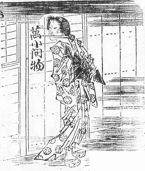 | 説明 | 神奈川県浦賀の三十になる小間物屋が同じ町の三十八の後家さんと割ない中になり、料理屋の奥座敷にしけ込んだのを知った女房が、憎いあの女の面に疵でもつけてやると、剃刀を口にくわえて立つおそろしい姿。女はすこし幅の狭い黒繻子の帯を前で結び、着ているのは夏のことで中形の浴衣か。記事によると女房は、外で偶然夫が女を連れ込むのを見て、剃刀を取りに家にとんで帰り、剃刀を口にくわえて帯を引き締め店の奥に入った――という。とすると、女のうしろの障子に萬小間物と書いてあるのは、この女の素性を読者に示すための結構で、ほんとうはここは料理屋の門口でなければならない。これから一暴れ、という場合であると、後ろ手で帯をしめるよりも、前でぐっと結ぶ、という方がちょうど向こう鉢巻きのように気分が乗るようだ。女の髪はじれった結びで、前を散らしているのは、庶民の女房の構わない恰好。相州浦賀などという田舎なら、この時代人妻がまだ眉を剃っているのがふつうだったろう。(大丸 弘) |