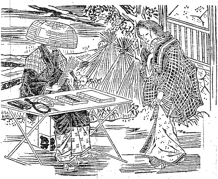 | キーワード | 占い師;菅笠;じれった結び;眉落とし;黒襟;襦袢の襟;格子縞の半纏;褄取り |