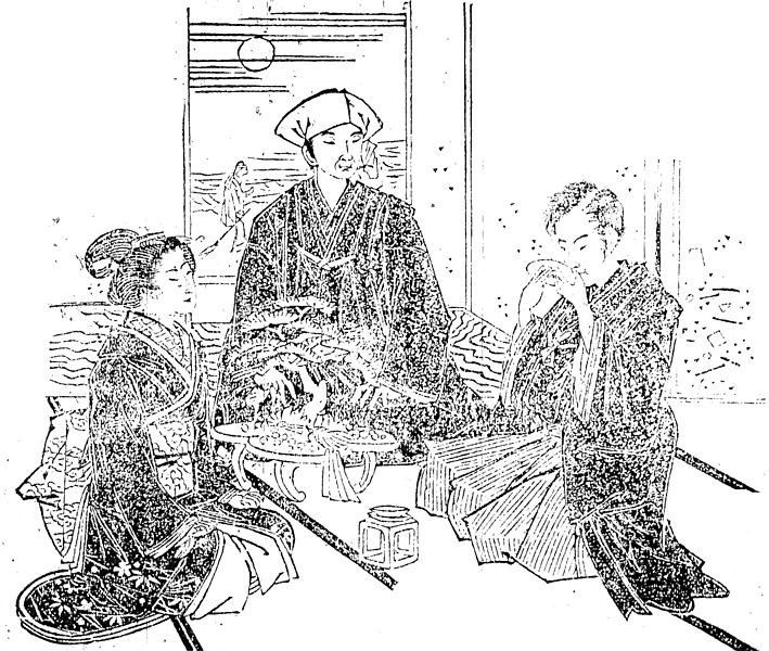 | 説明 | 旧士族の両親亡き後、養育してくれた叔父一家の貧しさを見かねて、大阪松島の廓に身を売った女。数年後、商売に成功した叔父の手で苦界から救い出され、生国の安藝に帰って似合いの聟も迎え、いま三三九度の杯事。その情景描写にリアリティーはないだろうが、床のめでたい翁の掛軸を背にしているのは叔父、被っているのは焙烙頭巾風の被りもの。花婿は紋附羽織袴で髪は七三分け。嫁は丸髷を結っている。花嫁は高島田であるのがふつうだが、少し年のいった嫁は丸髷のこともあった。裾模様のきものの、前褄の裏を返して座るのは武家風。褄投出しともいう。(大丸 弘) |
