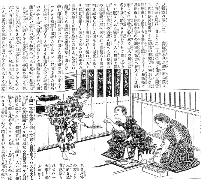 説明 強盗のし損ないで六十日の監獄暮らしをしてきた小盗人、下町の泥鰌(ドジョウ)屋でまたよからぬ相談をしている。手前の男は弁慶縞風の単ものに手綱絞りの三尺を締め、豆絞りの手拭いを肩に掛けて裾をまくり上げている。向こう側の男は薩摩絣の単。どじょうはそのころの東京郊外の田んぼや溝にはいくらもいたから、それをすくって売り歩くどじょう売りの中には子どももいた。泥鰌屋は鰻屋と比べてより庶民的で、同じく暮らし向きのいい家では食べなかった鯨汁といっしょに、割看板で提供している店が多く、それは後ろの壁のメニューに見るとおり。(大丸 弘)