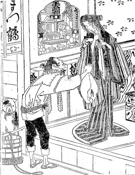 | 説明 | 船宿の女房が起き抜けの恰好で歯を磨いている。「寝巻の上へお召縮緬のねんねこ半纏を一寸と引掛け房楊枝をくわえたまま(……)」、芸者上がりの女だけに歯磨きを欠かさないのだろう。江戸時代から、細い竹の先をささらのようにした房楊枝を使っての歯磨きの習慣はあり、歯磨粉としての房州砂も有名。しかし毎朝歯を磨く女が少なかったのは、長い間のお歯黒の習慣のせいもあろう。明治に入ると新しい歯磨粉が売られるようになって、東京では仲町の小間物屋「たしがらや」で売っている品と、岸田の花王散が、上等のざらつかない製品だったと、練歯磨が入ってくる以前のちょうどこの時分の様子を、森鴎外は『雁』のなかに書いている。本文では寝巻の上にねんねこ半纏を重ねているように書いているが、挿絵でねんねこの下に着ているのは厚い袘(フキ)のある袷のきもので、寝巻のようには見えない。(大丸 弘) |