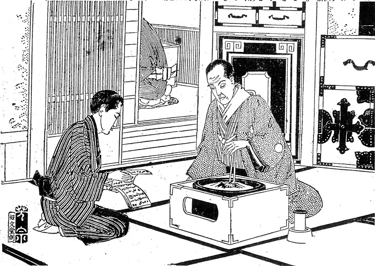 | 説明 | 東京・日本橋の両替屋の奥の間で、火鉢を前にした主人が手代から聴いているのは、一人息子の放蕩のこと。商売向きによってもちがうが大きな商家の構造は、表から見える店の奥には結界格子のなかで番頭が目を光らし、その番頭の背中の見える奥の座敷に金庫か、むかしなら金箪笥を背にした店の主人が控えている、というのが一般的。江戸時代の商家の多くは、朝、大戸を開けると一日中表は開けっ放しのため砂埃も入るし、冬は寒さの防ぎようがなかった。寒いときは店先には客のための小さな手あぶりが置かれるが、主人はたいてい奥の大きな火の傍で、こんな恰好をしていたものらしい。羽織は防寒のためのものでもあり、また奥の間まで通す客に対しては礼儀ともなる便利なもの。奉公人が店で羽織を着ることはどこでも禁じられていたが、店によっては、年功を積んだ番頭は外では許された。(大丸 弘) |