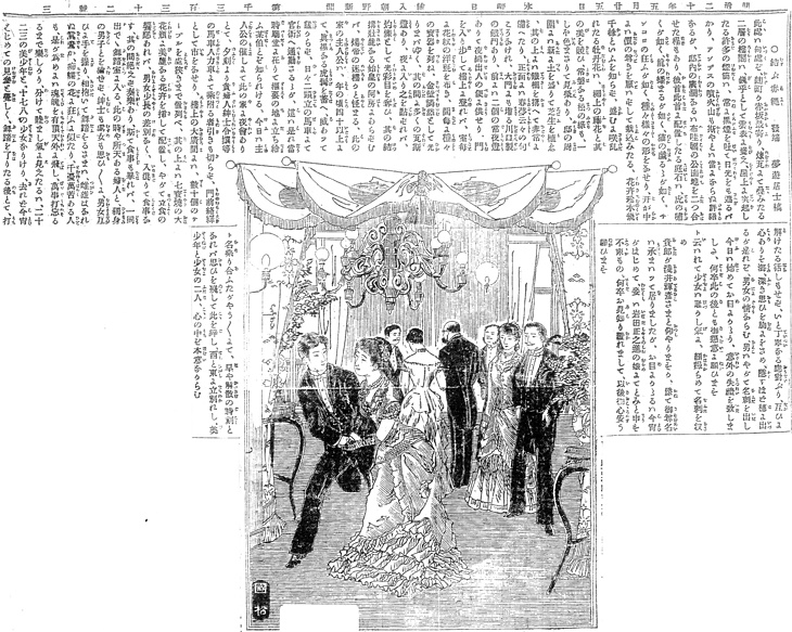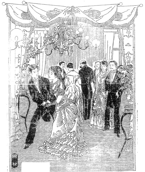 説明 某伯爵家における夜会の情景。「麹町の赤坂最寄り、煉瓦にて畳みたる二層の楼閣は、巍乎(ギコ)として雲表(ウンピョウ)に聳(ソビ)え、(……)壮麗なる始皇の阿房にあらざれば、煬帝の迷楼かと怪しまる」とある。江戸東京ではめずらしくもない二階建てなのだが、西洋館ということでこの時代、辺りを睥睨するような存在感があったようだ。出席者はいわゆる white tie(燕尾服)の正装。宮中伺候に限られる大礼服を除けばもっとも正式の装いの夜会に、立食というのはめずらしい。このころ、まだ立食に慣れていなかった日本人の振るまいが目に余ることがあった。ひとつには洋食や綺麗な洋菓子、見慣れない果物がものめずらしく、子どもの土産に、などという気がつい起こるのだろう。(大丸 弘)