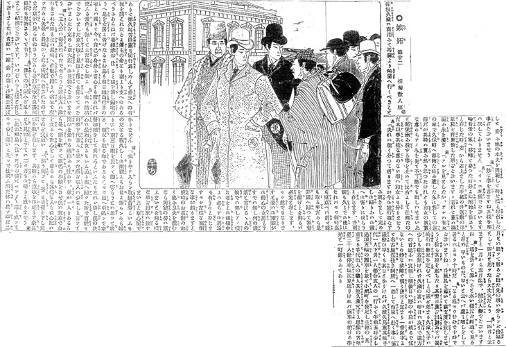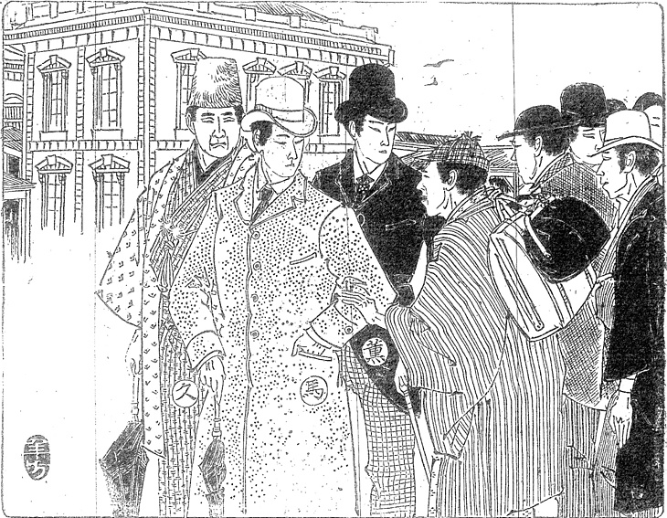 | 説明 | 商用で二,三カ月以上かけて九州方面へ出掛ける店主父子と、番頭格のこの物語の主人公の若者、供の手代と下男、それに見送りの人々が今、腕車(ワンシャ)、つまり人力を連ねて新橋の東京駅に着いた情景。店の主人は変り縞のきものに小紋の羽織、懐都合のいい連中の好んだ猟虎(ラッコ)の帽子。北海道方面のラッコはこの時代、日本や外国の狩猟船が取り放題であったため個体数が激減、数年後には免許制となり、やがて日本近海にはその姿が見られなくなる。中央手前の若主人の着ているオーバコートは、それまでの鳶外套に代わってこの時期に流行がはじまっている。『衣服と流行』(1895年)によると俗に「オーブル」と呼んでいたらしい。その後ろに従っている主人公と二人ともホンブルグ風の高帽。主人公の薫はモーニングを着ている。一般にこの時代は第二次大戦に近い時代であったらとても着られないような、礼装に近い服装――モーニング・コートやフロック・コート――を日常にも着ていて、背広の普及は遅れていた。(大丸 弘) |