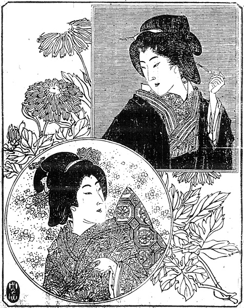 | 説明 | 旧大名である公爵家の入婿君が、三年間のフランス遊学から帰朝すると、かんじんの妻は病気のため姿を見せず、横浜の波止場に迎えに出たのは見違えるほど美しくなった義理の妹と、これも美しい妻の侍女。その妻は深窓に生い育って心優にやさしく、才も学も勝れてはいるものの、顔容(カンバセ)は美麗ならず、という危険な状況。挿絵の上部、黒い羽織に縞のきもの、手の込んだ縫いのある半襟を高くひきだし、珊瑚の珠付きの後ろ挿しの簪(カンザシ)で大丸髷に結った頭を掻いているのは姉君。また下部の、帯を矢の字に結んだ妹君は、肩揚げのある「裾模様古代蝶鳥白あがり染め所々に毛金色紙繍入りの三枚揃いの紋付きを優に着て」という衣裳付け。つづけて、見えるワケのない「紋縮緬友禅大紅入りの長襦袢」まで丁寧に描写してあるのはご愛敬で、三越や白木屋のお見立てのようだが、この時代の読者に、令嬢のイメージをそれらしく伝えるためには必要だったのだろう。(大丸 弘) |