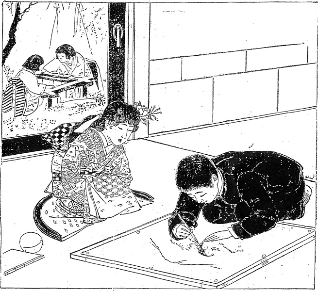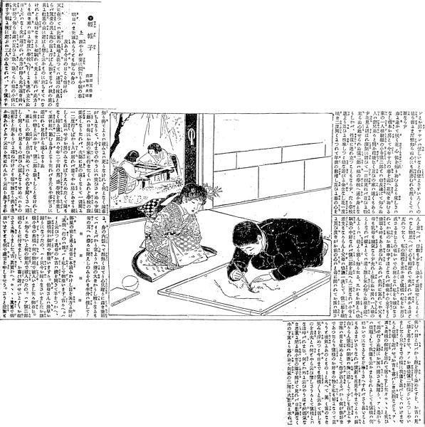 | 説明 | とりたてていうほどの起伏もない恋物語。近くに住む親戚同士で幼いときから慣れ親しんでいたふたり、男が二十四、娘が十六になった春、跡取り娘のもとに男が婿入りするというかたちでの恋が成就した。挿絵は二人がまだ十代と思われる頃の回想の一齣か。中学生と思われる少年が絵絹を前にしている。中学生の制服は早くから同時代の軍服、とくに陸軍の軍服をコピーした。警視庁その他の警官の制服も、同様にほぼ軍服のデザインにしたがったので、学生と巡査の黒い詰め襟服は日本の街の景観に特異な印象をうみだすことになる。十歳ほどの少女はお下げの髪に造花を挿し、肩揚げのあるきものの長い袂を胸に抱えている。石畳模様の帯は大きな竪矢結び。女性が身繕いして座るときは、きものの裾が美しく、半月系に広がるように心掛ける。中・近世の高位の女性のゆたかな曳裾の場合それを褄投げ出しと言っている。この時代も正月だけはまだ裾を曳く女性が多かったので、女の子もそれを見よう見真似していたかもしれない。(大丸 弘) |