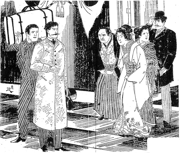 | 説明 | 華族の若君が外遊から帰朝、いましも新橋の東京ステーションに到着して家人の出迎えを受けている情景。帰朝者はたいてい彼の地の流行を身につけているので、着ている外套は日本でこの頃知られはじめたチェスターフィールド系のものだろう。ピンと横に固めた口ひげはドイツ風。外套の下は縞のズボンなのでモーニングか。.迎えている嫂は派手な好みの裾模様、とあるがやや江戸褄風に前褄に登っている。江戸褄はこの頃から芸妓のあいだではじまったもの。粋すぎるので、素人の婦人には如何にやと、『衣服と流行』(1895年)では言っている。季節は4月ということで袷の三枚襲か、たぶん裾綿はたっぷり入っていて、端折ってはいても、駅の床を掃くばかりに豊かに裾がひらいている。実際にはこういう効果は生じないはず。中央でお辞儀をしている袴の家扶は靴を履いている。この時期、和装でも靴の方が、草履や下駄より格が上、とされていた。右端の長身の男性の着ているのはフロックコートだが、やや不自然に丈が短い。(大丸 弘) |