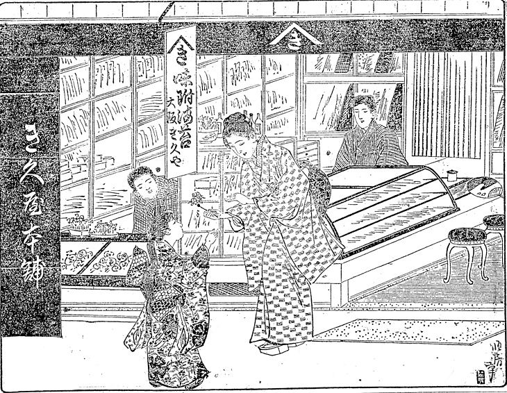 | 説明 | 大阪心斎橋筋の小間物屋の店先。住み込みの女教師が、預かっている少女と、夕涼みの散歩がてらに立ち寄った小間物屋で、約束の花簪(カンザシ)を買って与えている。女教師は上げ巻の束髪。この時期、束髪は以前ほど結う人がいなくなっていて、ことに大阪は東京に比べると、束髪の女性も洋服の男も少なかった。小数の知識人――女教師などが主な束髪女性。小間物屋は古い業種だがたえず流行を追う商売だけに、ガラスのショーケースや椅子などに開化風を見せている。軒看板に味付け海苔とあるのは理解できないが、あるいは特別なルートによるこの店のスペシャリティーか。少女自身のための花簪のほか、姉へのお土産に高蒔絵の護謨櫛お初形を買う。護謨製はこれも開化の新製品で、ものめずらしさから一時は人気があった。しかし鼈甲のまがい物などが作られるようになって嫌われたという。(大丸 弘) |