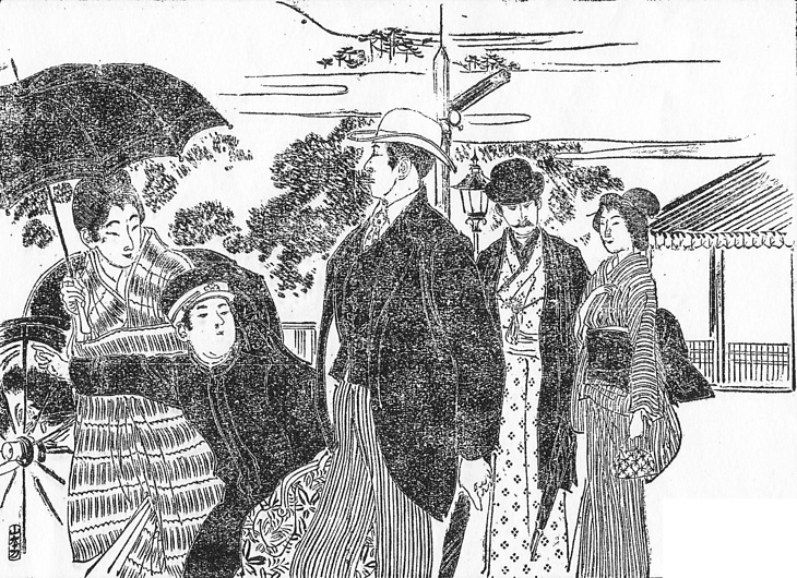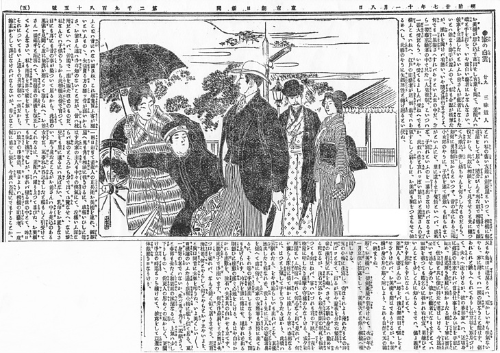 | 説明 | 元旗本の御新造が夫に先立たれ、仕立物の賃仕事などで幼い子どもとの生活を守っていたが、思いきって柳橋から芸者に出る、というこの時代にはめずらしくない筋書。ただしこの日の挿絵は、そういう筋書きよりはるか先を行っていて無関係。芸者はしていても子どもと一緒に住んでいるために、客と遠出でもこんな親子のような様子になれる。お座敷にはもちろん島田を結わねばならず、長いこと人妻の丸髷だったため最初は「恥ずかしいやら味気ないやら」だった。しかし今日は好き勝手な束髪を結っている。客の男はモーニングに縞のズボンの三揃えで、遊びに行くにしてはずいぶん堅い恰好だが、モーニングはこの時代、後々の時期の背広並みに考えられていた。一般に洋服の受容において、カジュアルウエアの導入がもっとも遅れている。(大丸 弘) |