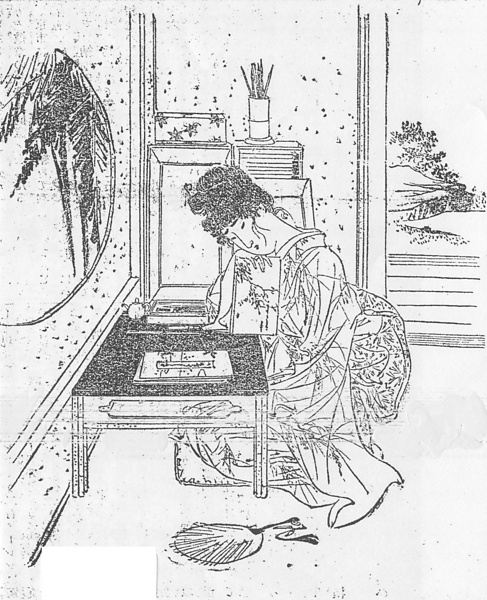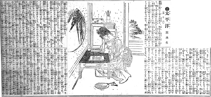 説明 本文では主人公の娘が障子も襖もたてきって、風も入らない部屋の中にじっとしていることになっているのに、画家は風通しの良さそうな夏座敷を、縁先の庭の石組みや、机の前の丸窓に覗いている芭蕉の葉までも描いている。思う人の冷たい態度に気を腐らせている娘が、閉め切った部屋に閉じこもっているのを、うすうす娘の思いを察している母親が、涼しい風に当たり海や山の景色でも見れば、気分も爽快(サッパリ)となるよと、妹や客たちの待っている二階に伴う――というのがこの日の筋。となると、画家はどうやら、作者の意図をあまり理解しないままでこの日の挿絵を描いたことになる。娘の結っているのは上巻の束髪。前髪を垂らすのもよく見るスタイルだが、文字資料にはあまり出てこない。(大丸 弘)