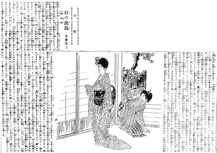 | 説明 | 村井弦斎と村上浪六とは、明治後期の大衆にもっとも人気のある作家であったと同時に、その後の大衆には急速に忘れられてしまった、という点でも共通している。その理由はわからないが、大長編である弦齋のこの『日の出島』や、浪六の同じく大長編『八軒長屋』などは、どちらも寄席で聴くくすぐりのような諧謔(カイギャク)趣味が基調になっていて、それはこの挿絵にも共有されている。上京してくる夫の両親、つまり舅姑にはじめてお目にかかるというので、念入りに磨き上げた、あんまり御器量がいいとはいいにくい奥様の晴れ姿、下女たちが小声で「御出座ァ」と声をかけて口元を押さえて笑っている。この時代、不美人には決まった顔かたちがあって、それは女中などの顔というと常套的にそう描かれた。しかし教育もある奥様を女中顔に描くわけにはいかない、というところに画家の苦心があったろう。曳裾は一般にはもうなくなっていて、正月などおめでたい行事だけに曳く、という風になっていた。もはや大仰な姿になりつつあったのだ。(大丸 弘) |