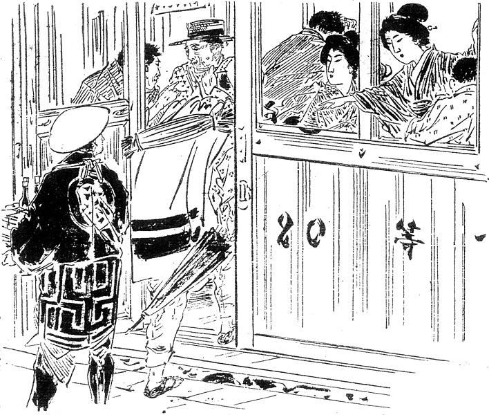 | 説明 | ヒロインが汽車の旅の車中でたまたま話し相手になった、東京で下宿屋を経営しているという中年女から、訪ねる人の消息を知る。汽車の窓とはとても見えない頑丈そうな窓から身を乗りだして、ホームの弁当屋を呼んでいるのがヒロインか。前に座っている女性とも丸髷だが、若い女性ほど髷が大きい。弁当売りの着ている印半纏はきものの上から羽織っているだけで、尻端折りしているきものの裾が半纏の裾から見えている。菅笠を被り、半纏と同色の紺の脚半におそらく草履ばきだろう。いま汽車に乗り込もうとしている男は、手拭い被りでケットを着ている。裾に太い横縞の二本あるケットは、明治前半期にどちらかといえば地方で愛用されたが、大都会ではあまり利用する人も機会もなく、赤ゲットが田舎者をさす異称になったのはよく知られている。背中にしょっているのは瓶など壊れ物を運ぶための藁苞(ワラヅト)。(大丸 弘) |