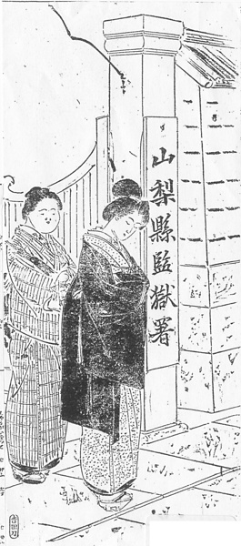 | 説明 | 罪を犯して収監された身寄りの女性との面会から帰る、村の物持ちのご内儀。ご内儀といってもまだ二十歳前の若さで、丸髷の髷はごく大きい。この髷の大きさは流行も土地柄もあるが、ふつうは年齢とともに小さくなる。大きくするためには髷形という硬い紙製の型を入れ、この型に大きさの番号が付けられていた。小紋の羽織に黒縮緬の羽織、小町型の刳り下駄、この時代上等の下駄は塗りが多かったが、暑いじぶんは白木も好まれた。ご内儀も後に従う女中も、きものの裾に輪郭をとるような、濃い色の厚い袘(フキ)が出ている。器量よしのご内儀に比べて、女中の顔は人間の顔のように見えず、お面を被っているようだ。当時の挿絵画家は、女中といえばお盆のように丸顔で、目鼻の言い訳ばかりにあるような、こうした醜女に描くのがふつうだった。刑務所は1872(明治5)年の太政官布告によって〈監獄規則〉が公布され(→年表〈事件〉1872年11月 「監獄則並びに図式の頒布」1872年11月27日)、各県に監獄が設置された。柿色の囚人衣もそのときに決められている。(大丸 弘) |