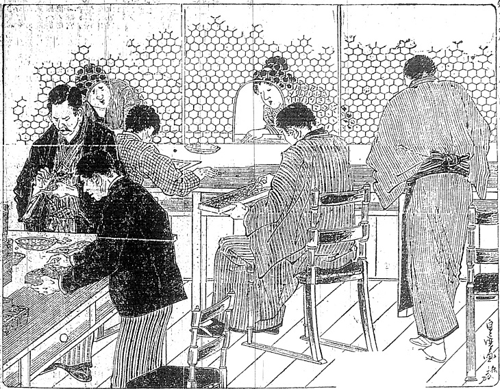 | 説明 | 中央、金網の向こうから顔を覗かしているのは、この銀行の行員の妻。初期の銀行は大名貸しで身代を膨らませた商人が、開化とともにとりあえず銀行の看板をあげたような店もあり、店内のたたずまいは商家とお役所を混交したようだったようだ。窓口の係員は縞のきものに角帯、前垂れ掛けという、呉服屋の手代とちがいのない姿。奥で計算中のスタッフはもう少し地位の高い連中という意味でか、黒紋附の羽織を着て八字髭を生やしている男や、フロックコートに縞のズボンの男がいる。この時代、髭は官員様のきたしるしで、商人(アキンド)で髭、ことに八字髭を生やす人はよほどめずらしい。窓口の金網は当時の欧米のスタイルをそのまま模倣している。(大丸 弘) |