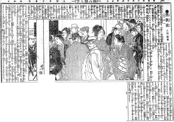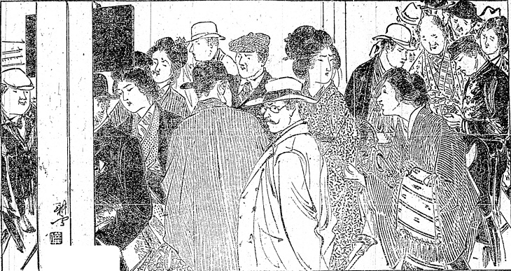 | 説明 | 上野停車場の混雑する改札。このくだりの主要人物は中央やや左、黒の山高帽に縞の羽織の男と、島田髷のその娘。どちらもあとからくる下女の方を見返っている。このふたりの衣裳付けは念入りで、とりわけ宝飾品につては、「無造作に捲き附けた浜縮緬の兵児帯へ、金鎖をやけに絡んで、七,八匁から十匁もありそうな金の指環を、節くれ立った両手へ二個ずつ嵌めている」のが父親。帯締めに、「下げ緒打の烏金(シャクドウ)好みのパチンとに托し、指環もルビー入りの小さいのを嵌めている」のが娘。帯締めはそれまでの打紐に対して、1880年代(明治10年代)に金属のいわゆるパッチンが現れた。これはその数年前の廃刀令で不要になった、刀の目貫を利用したのがはじめ、という説がある(大西白牡丹主人「婦人用装飾品」【婦人界】(金港堂) 1904年5月)。烏金というのは赤銅の別称で、この時代の振り仮名によくあるように、べつの言い方や説明を振り仮名にしている。(大丸 弘) |