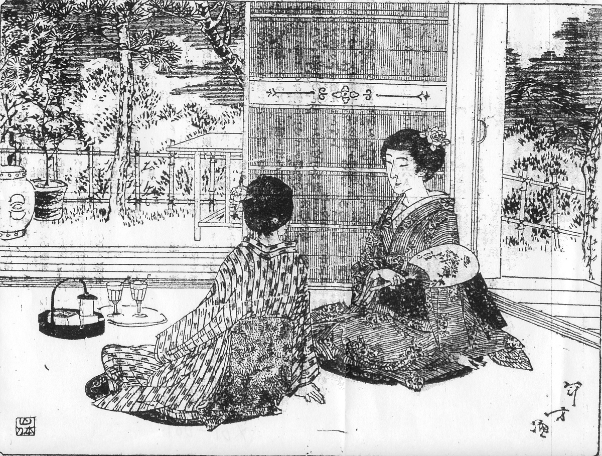キーワード 夏座敷;造花;竪縞のきもの;白飛白のきもの;お太鼓結び;うちわ;座り方;アイスクリーム;ガラス食器;お盆;煙草盆;簀戸(すど);簾戸(すど);葦戸(よしど);廊下;鉢植え