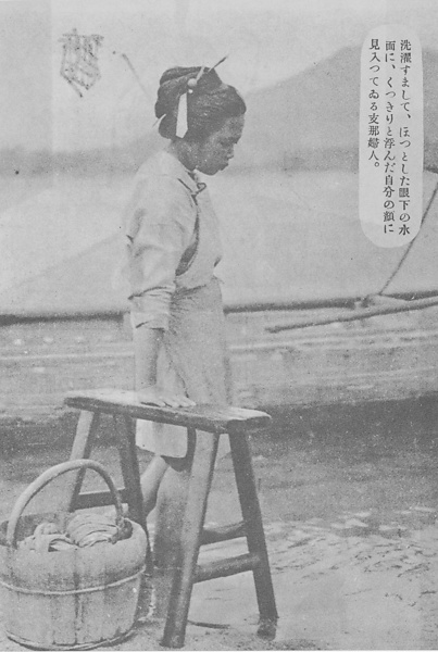 | タイトル | 洗濯すまして、ほつとした眼下の水面の水面に、くっきり浮んだ自分の顔に見入っている支那婦人 |