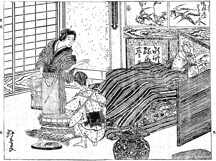 | キーワード | 産婦;病鉢巻き(やまいはちまき);産婆;襷掛け;黒襟;産湯;うぶ湯;盥(たらい);手桶;腰屏風;天袋;温度計;障子 |