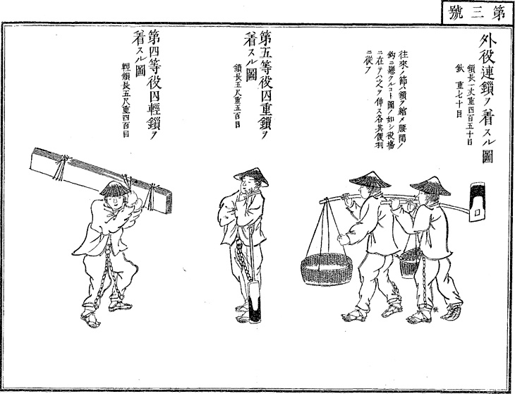 | タイトル | 外役連鎖ノ着スル図/第五等役囚重鎖ヲ着スル図/第四等役囚軽鎖ヲ着スル図 |