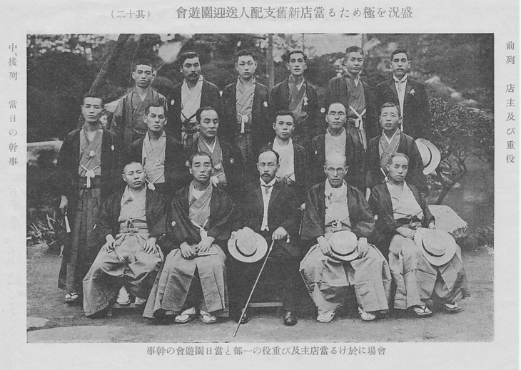 タイトル 盛況を極めたる当店新旧支配人送迎園遊会:会場に於ける当店主及び重役の一部と当日園遊会の幹事