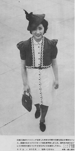 | 備考 | 白地に濃紺のパイピングを配した爽快な初夏の白雲を思はす軽快なドレス。純綿の白オツクスフオード地を使用致しました。御外出の折にはドレスの配色の紺にマツチさせたボレロをお召し下さい。ドレス¥10.00 ボレロ¥6.00モデル・OSSK・牧野バラ子さん |
