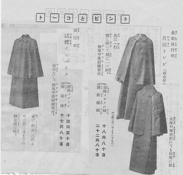 | キーワード | [インバネス;トンビ;鳶(とんび);二重回し;二重廻し;二重外套;二重マント];詰襟インバネス;片前トンビ |