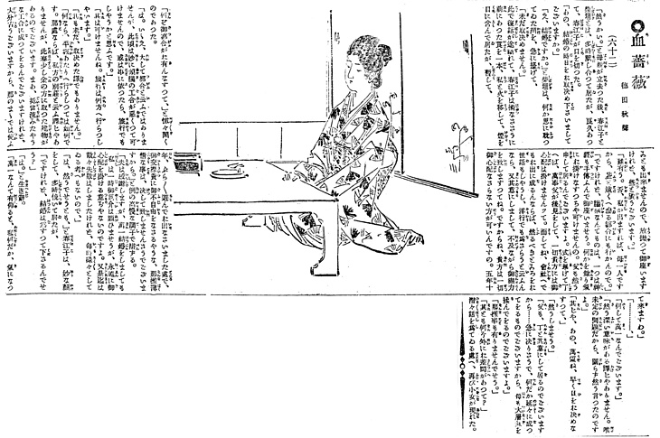 1903(明治36)年、1904(明治37)年、1905(明治38)年当時の花月巻の流行はずいぶん盛んだったようだ。明治20年代の束髪は後頭部にひっついたような縦型の髷で、華やかさの乏しいものだったから、山の手の教育のある家庭の女性や、女教師などのほかはあまり結う人がなかった。それが川上貞子風とか下田歌子風とかいわれるものを経て、前髪を膨らますことが時代の好みに合い、最初はとりわけ前髪を高く盛りあげている。そのため、毛の少ない人は金属製の輪のようなものを使って膨らませた。花月巻というのは、前髪とは無関係な頭頂の髷の結び様なのだから、結んだ人以外にはよくわからないだろう。この小説のヒロインの髪については作者の徳田秋声が第16回で「髪を花月巻というのにして」とはっきり指示し、挿絵担当の筒井年峯によって同じ髪型がくりかえし描かれている。第25回はもっともはっきり描かれている場合で、髷にバラの造花が飾られている。ヒロインは愛する庇護者に捨てられて、みずから命を絶つ悲劇の人で、貧しい娘だが、その敵役の派手な金持ち娘も第62回で花月巻、また第29回でお茶を運んでくる下女も花月巻、花月巻の流行ぶりが理解される。もっとも髷自体が花月巻なのかどうかは実はわからない。前髪を大きく、高く膨らませたスタイルが花月巻風、ということだ。(大丸 弘) |