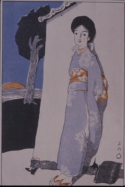 | キーワード | 塀にもたれる少女;真ん中分け;斜めの帯締め;ぞうり |