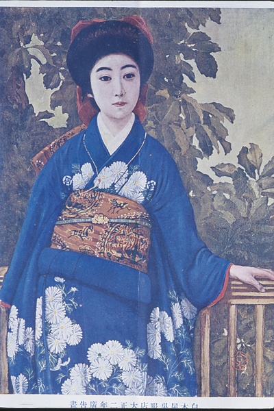 | 身装画像コード | D7ta:[大衆美人画の女性(この年の広告イラストなどに描かれた女性像)] D004:[適齢期の娘;新造;(1) 嫁入り前の娘,新妻,さらに一般の他家の妻女をいう。] D2hi:[束髪(庇髪など、後期平型の)] D1ka:[髪飾り(櫛,簪,リボン)] Vhan:[半襟] D3ob:[帯の締め方;帯の位置] Wto:[時計;時計鎖] |