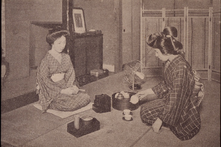 | キーワード | 来客のもてなし;茶の接待;束髪と日本髪の対比;竪縞のきもの;扇風機 |